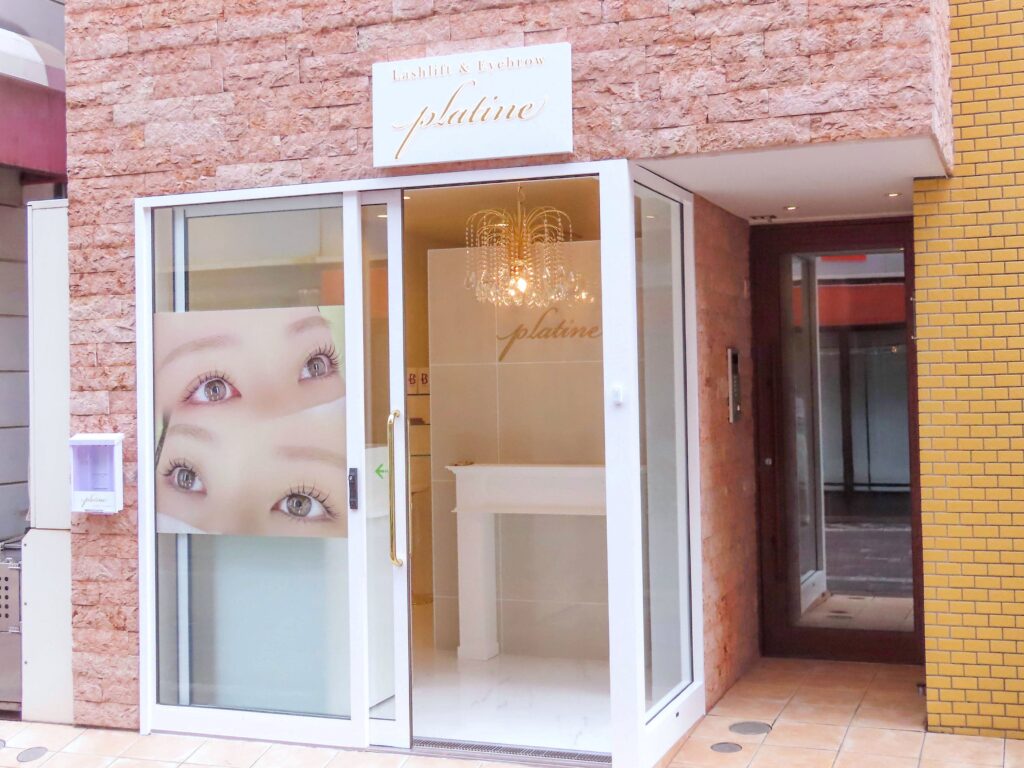 路面店ならではの開放感あるエントランスには、大きなアイラッシュのビジュアルとシャンデリアが輝き、華やかな存在感を放ちます。